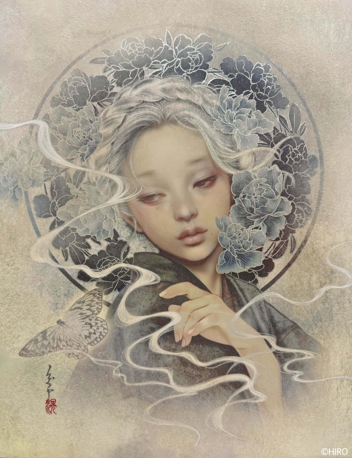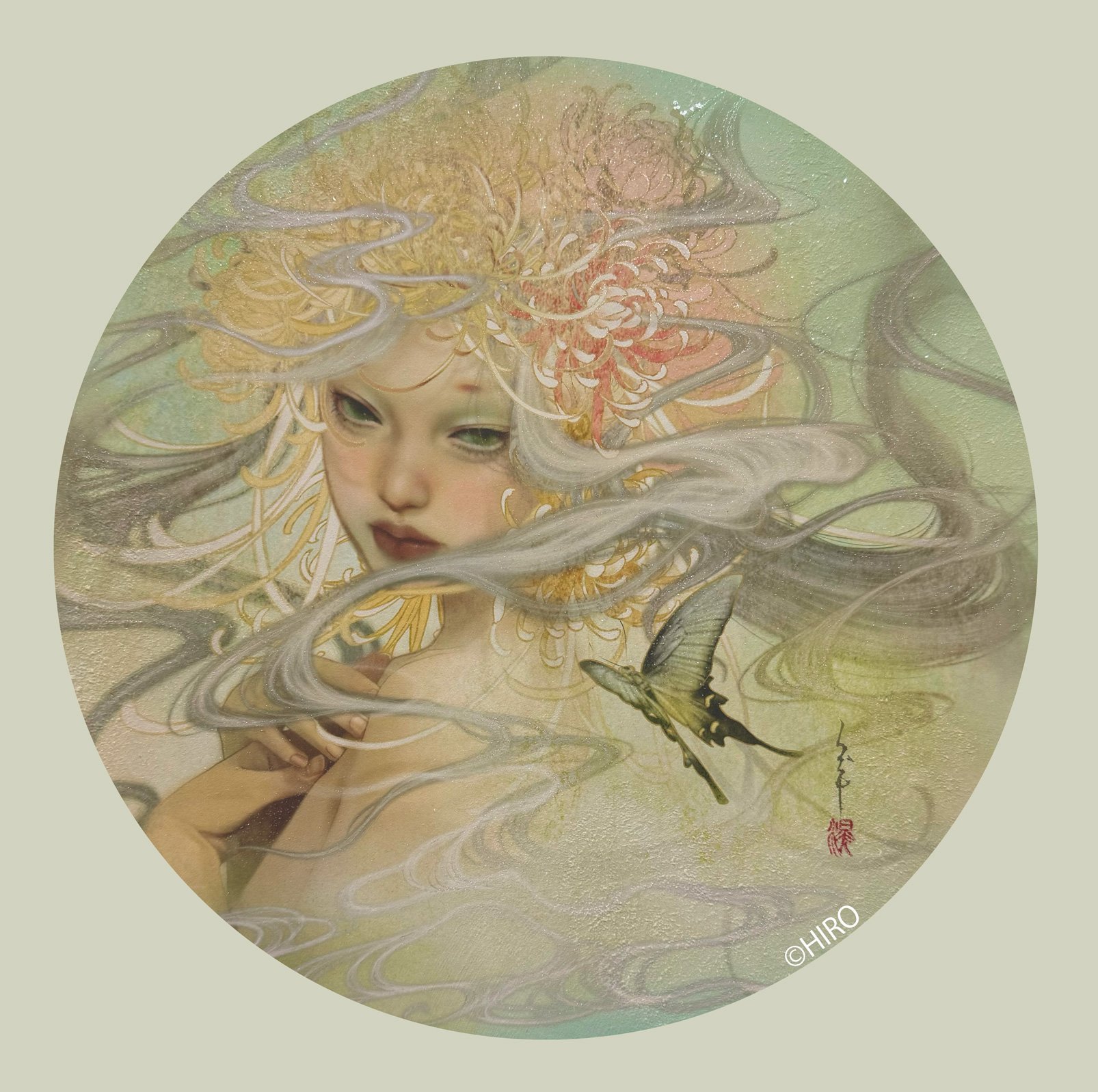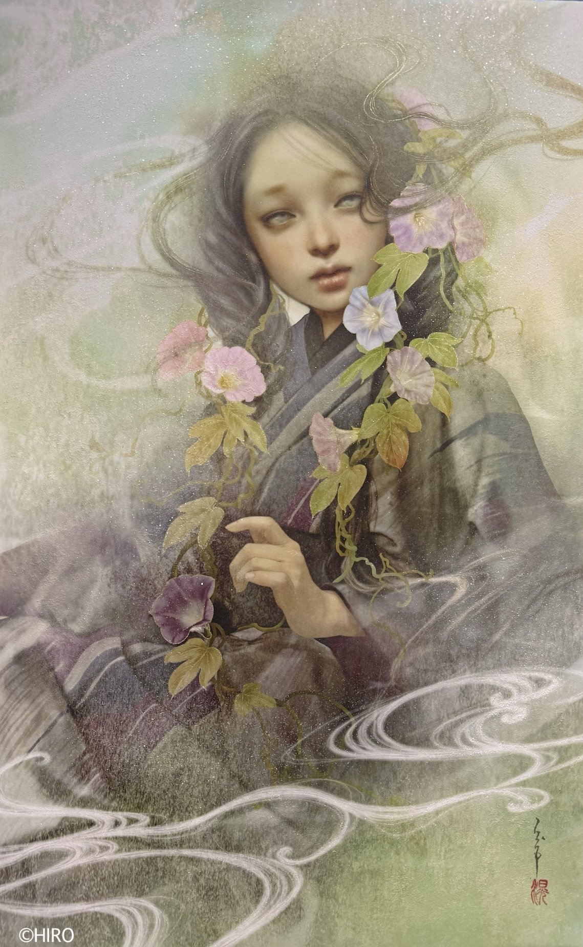 HIROの作品について:HIROの技法は、麻紙にドーサや胡粉、水晶松を引き、顔料インクでプリントアウトをし、そこに岩絵具、顔料絵の具、雲母等で手彩色をした1点ものです。