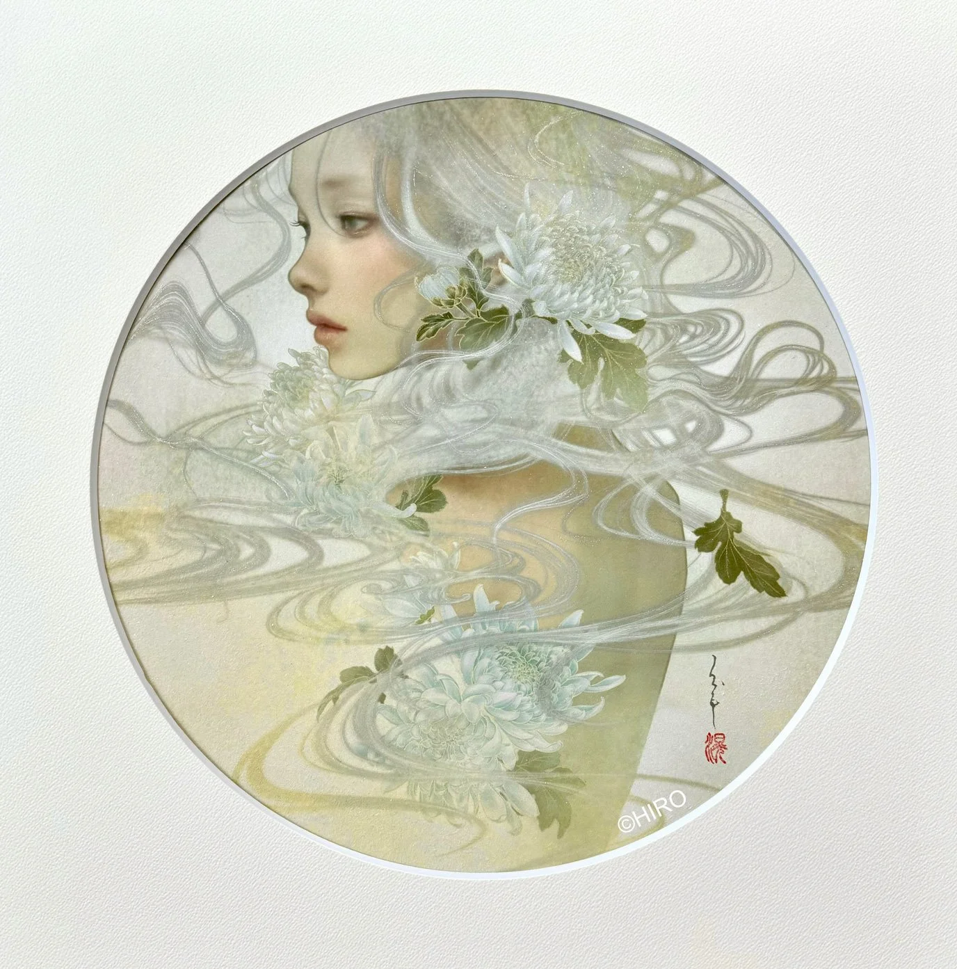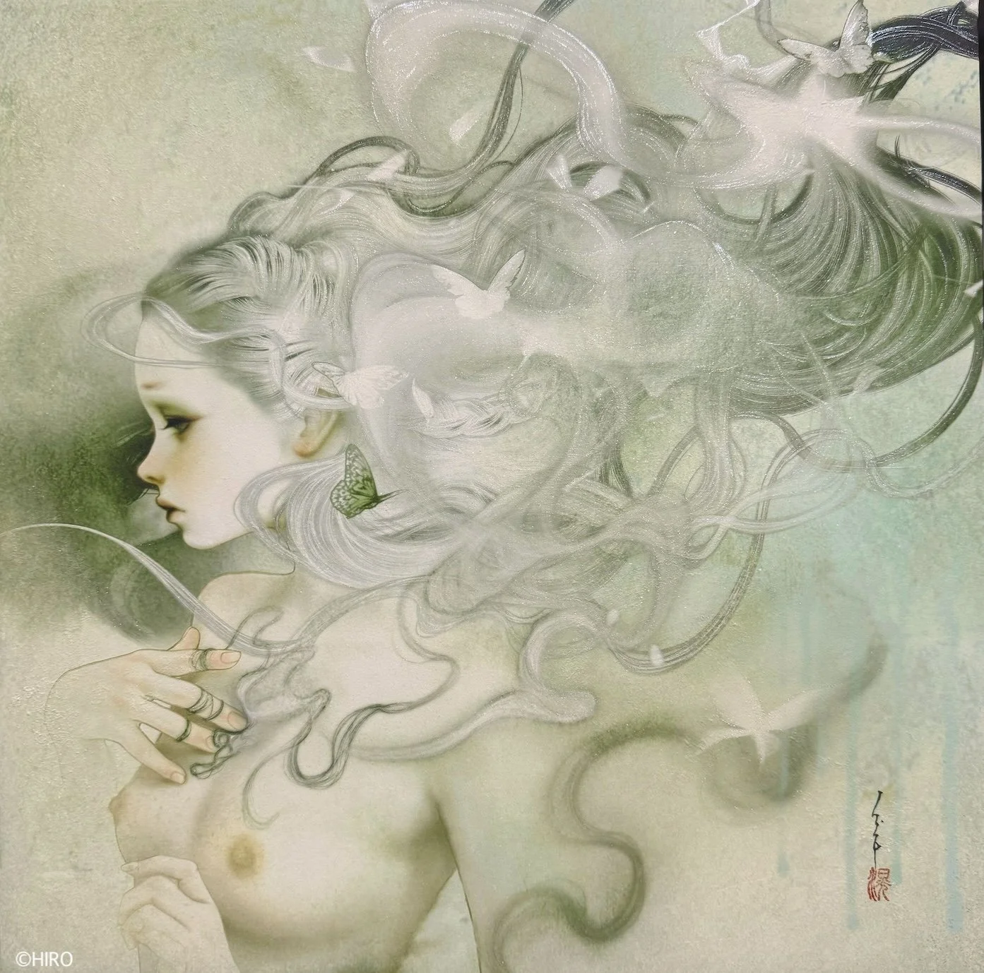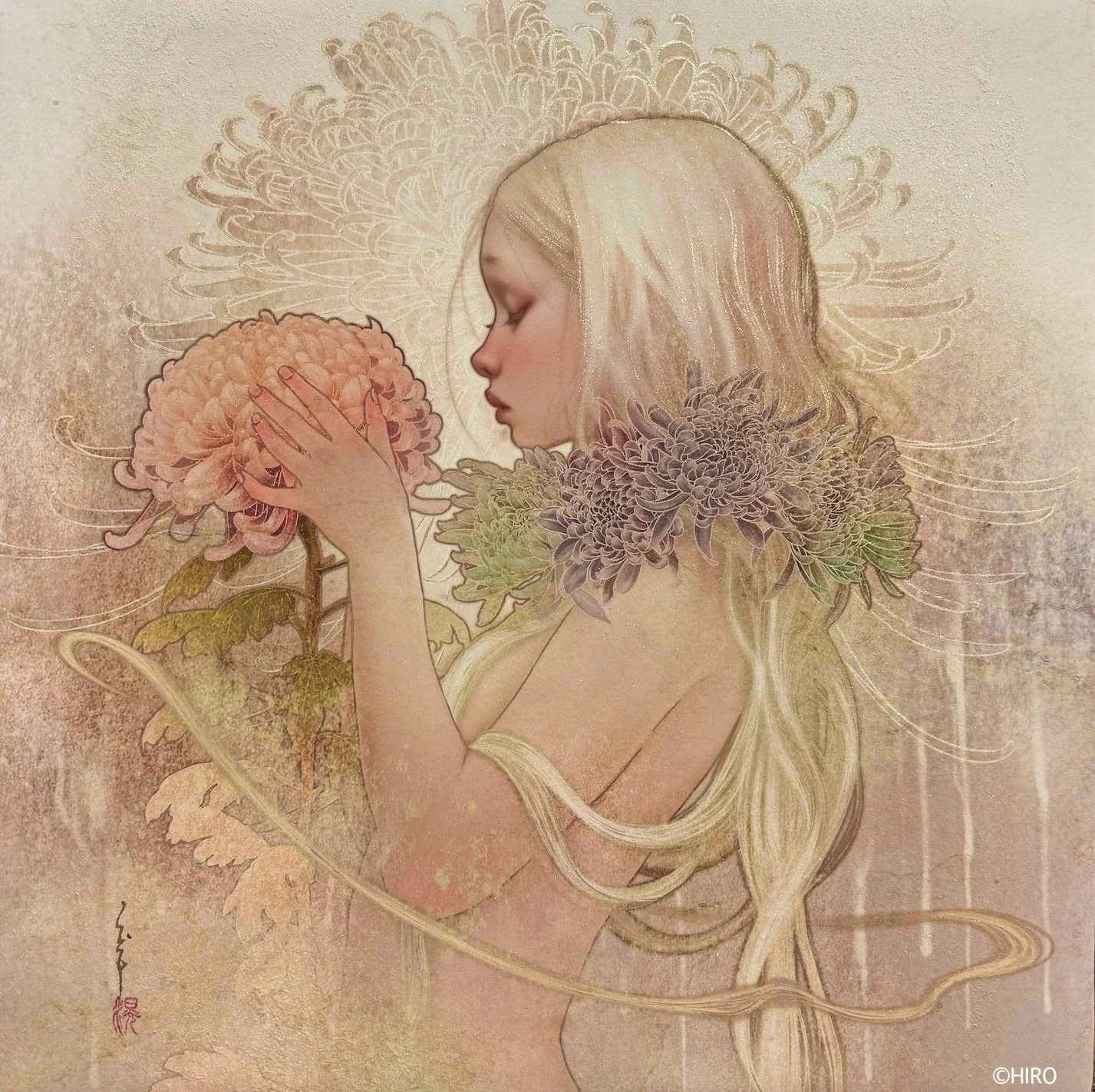 HIROの作品について:HIROの技法は、麻紙にドーサや胡粉、水晶松を引き、顔料インクでプリントアウトをし、そこに岩絵具、顔料絵の具、雲母等で手彩色をした1点ものです。